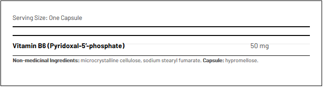 werkzame stof (pyridoxaal-5'-fosfaat), vulstof (cellulose, magnesiumstearaat uit palmolie), antiklontermiddel (siliciumdioxide), capsule (hydroxypropylcellulose)