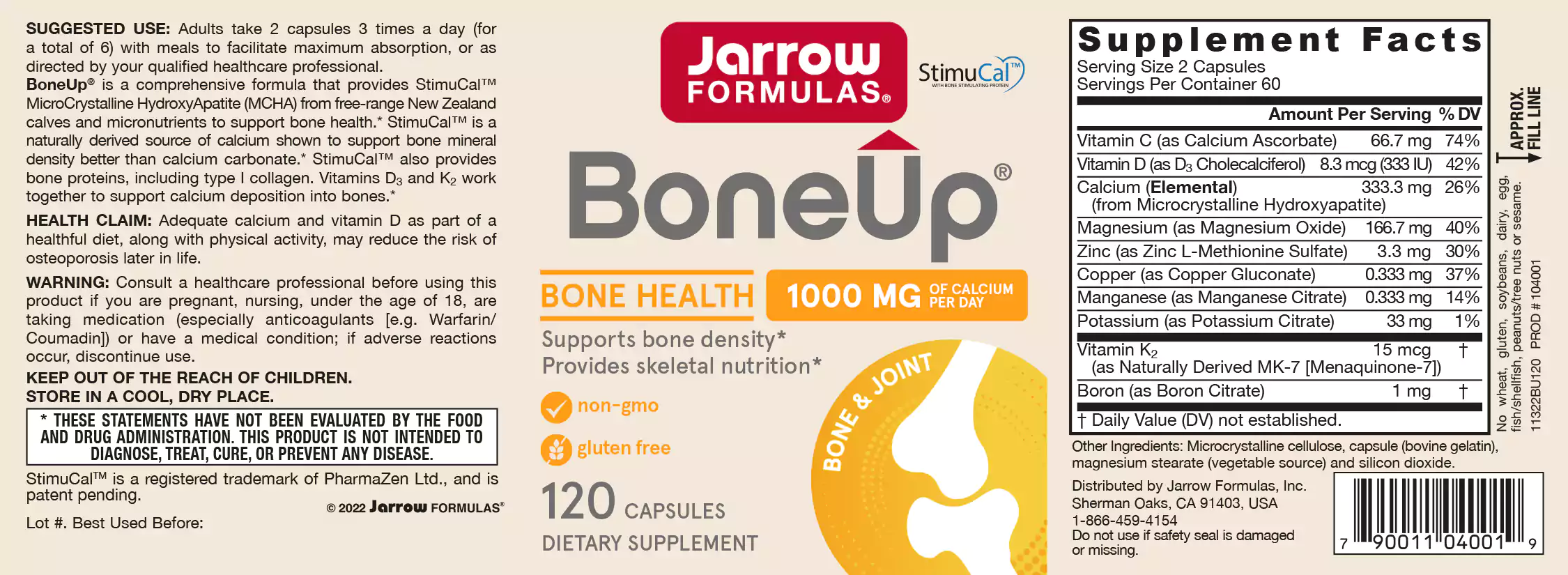 Jarrow Formulas Bone-Up biedt de geavanceerdste en compleetste voeding voor sterke en gezonde botten. Bone-Up maakt gebruik van de beste bron van calcium dat beschikbaar is: microkristallijne hydroxyapatiet uit Australische runderbotten van grasgevoede kalveren, die gegarandeerd vrij zijn van hormonen en ziektekiemen of prionenen die BSE veroorzaken en geslacht zijn voor ze 2 jaar oud zijn.