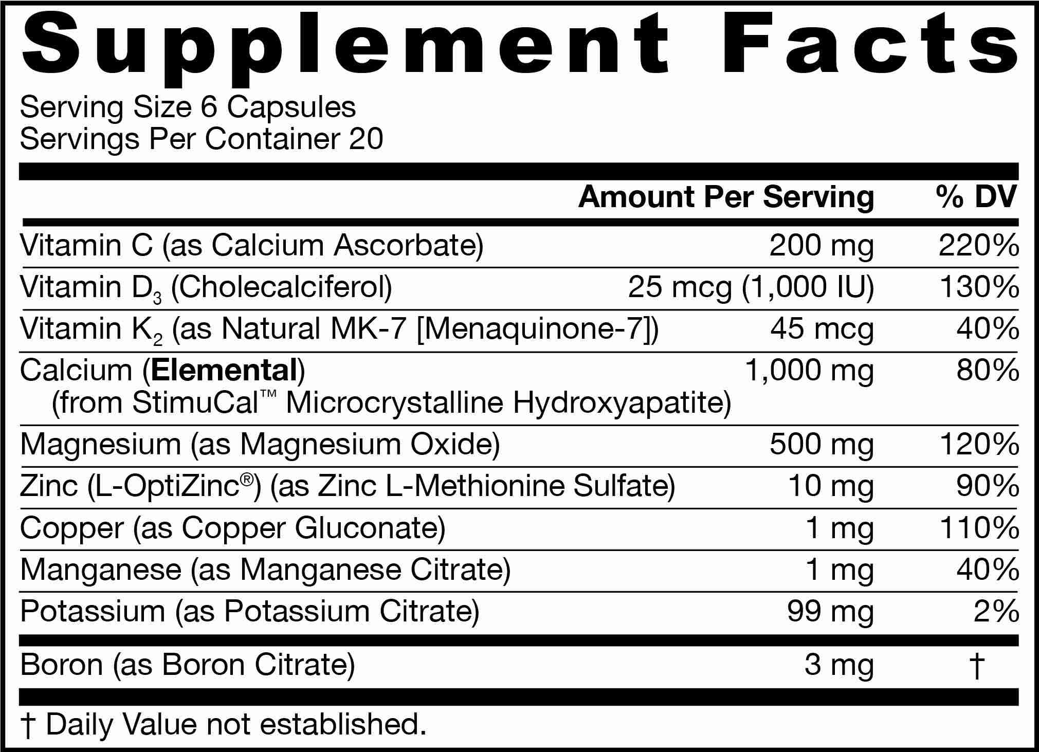 werkzame stoffen (MCHA (Microcrystalline Hydroxyapatite) calcium, fosfor, magnesium, ascorbinezuur, zink, borium, koper, mangaan, cholecalciferol, menaquinone), vulstof (cellulose, plantaardig magnesiumstearaat), anti-klontermiddel (siliciumdioxide), capsule (rundergelatine)