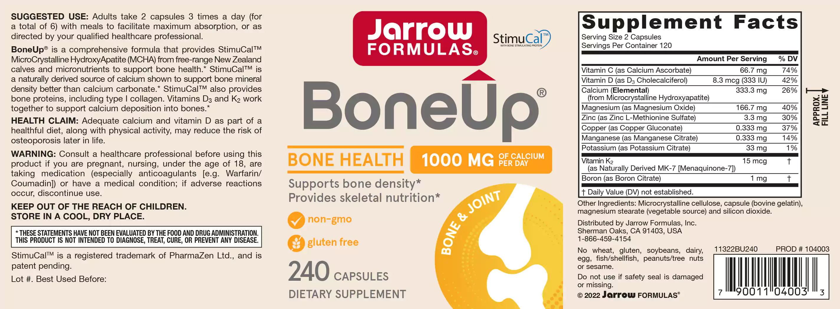 Jarrow Formulas Bone-Up biedt de geavanceerdste en compleetste voeding voor sterke en gezonde botten. Bone-Up maakt gebruik van de beste bron van calcium dat beschikbaar is: microkristallijne hydroxyapatiet uit Australische runderbotten van grasgevoede kalveren, die gegarandeerd vrij zijn van hormonen en ziektekiemen of prionenen die BSE veroorzaken en geslacht zijn voor ze 2 jaar oud zijn.