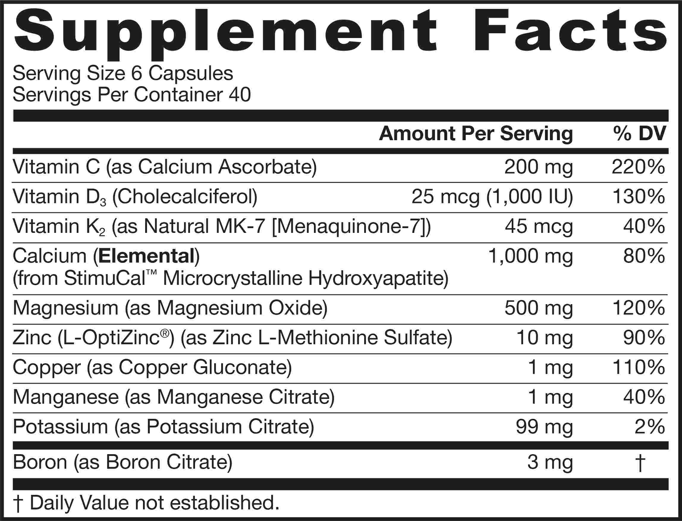 werkzame stoffen (MCHA (Microcrystalline Hydroxyapatite) calcium, fosfor, magnesium, ascorbinezuur, zink, borium, koper, mangaan, cholecalciferol, menaquinone), vulstof (cellulose, plantaardig magnesiumstearaat), anti-klontermiddel (siliciumdioxide), capsule (rundergelatine)