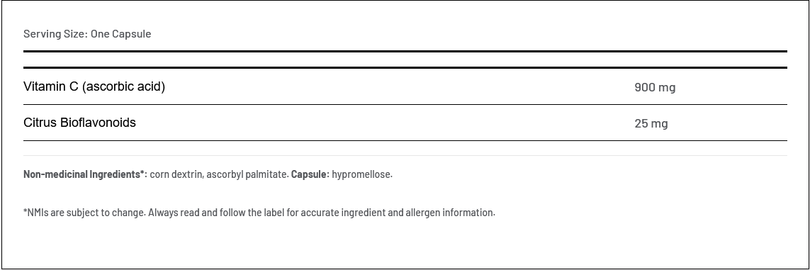 werkzame stof (ascorbinezuur, citrusbioflavonoïden), vulstof (maïsdextrine, ascorbylpalmitaat), capsule (hypromellose)