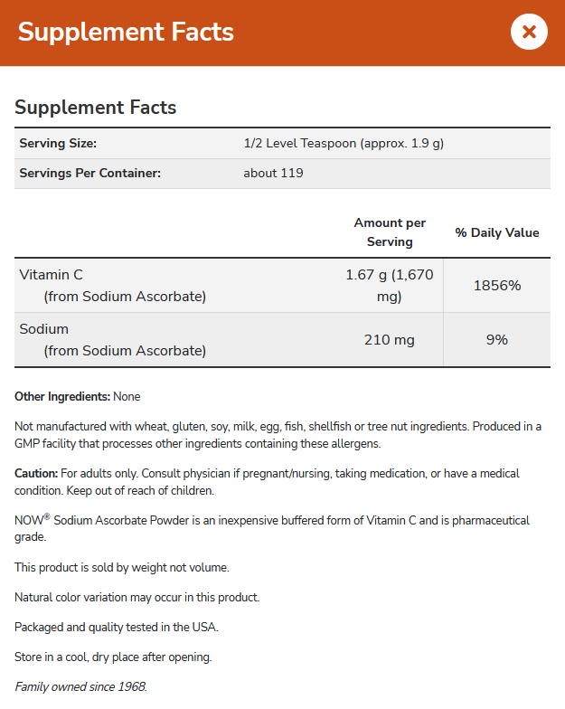 Dit product levert natriumascorbaat C, een gebufferde vorm van vitamine C die biologisch beschikbaar en niet zuur is.