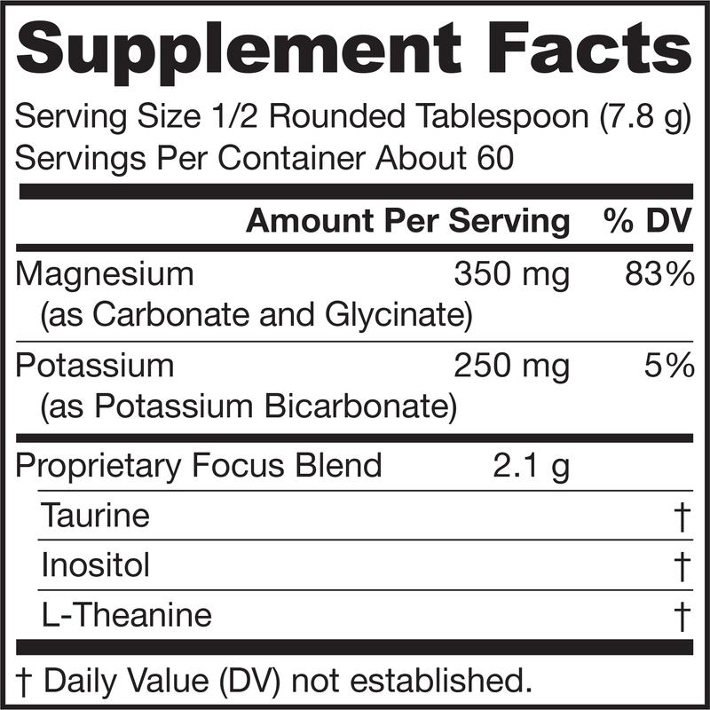 werkzame stoffen (gepatenteerd focusmengsel (taurine, inositol, theanine), magnesiumcarbonaat, magnesiumglycinaat, kaliumbicarbonaat)