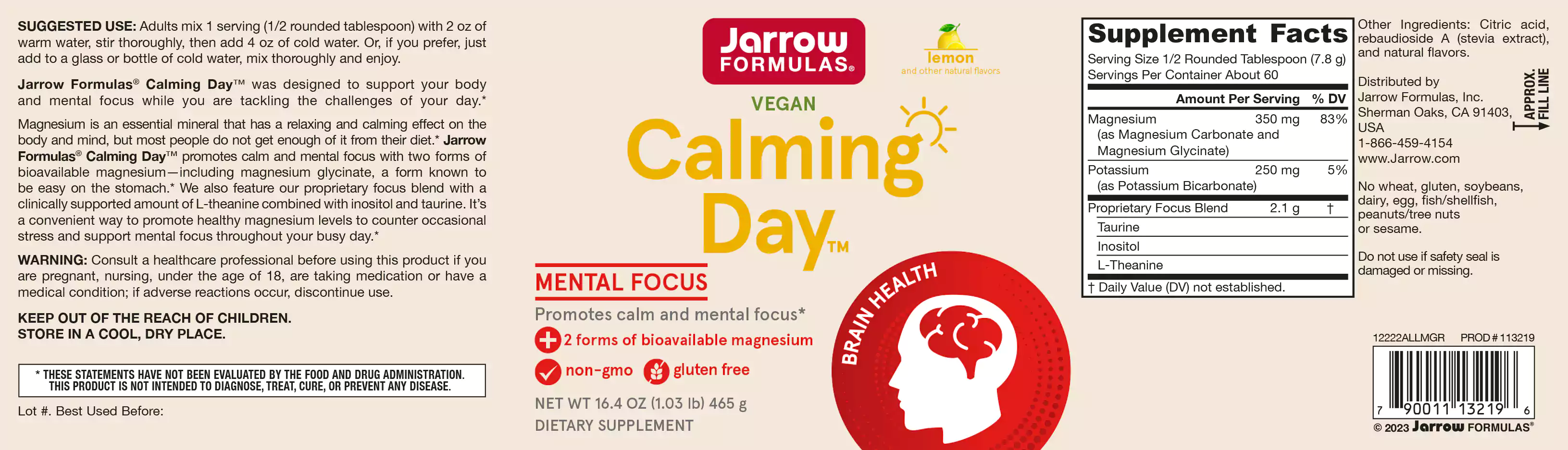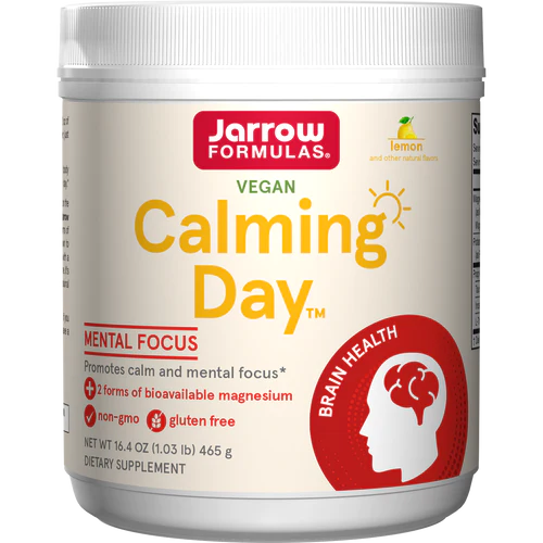 Jarrow Formulas® Calming Day™ bevordert kalmte en mentale focus met twee vormen van biologisch beschikbaar magnesium, waaronder magnesiumglycinaat, een vorm waarvan bekend is dat deze de maag niet belast.