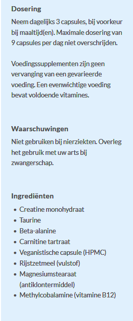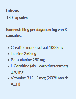 werkzame stoffen (creatinemonohydraat, carnitinetartraat, beta-alanine, taurine), capsule (HPMC), natuurlijke kleurstof (anthocyanen uit paarse wortel), werkzame stof (methylcobalamine)