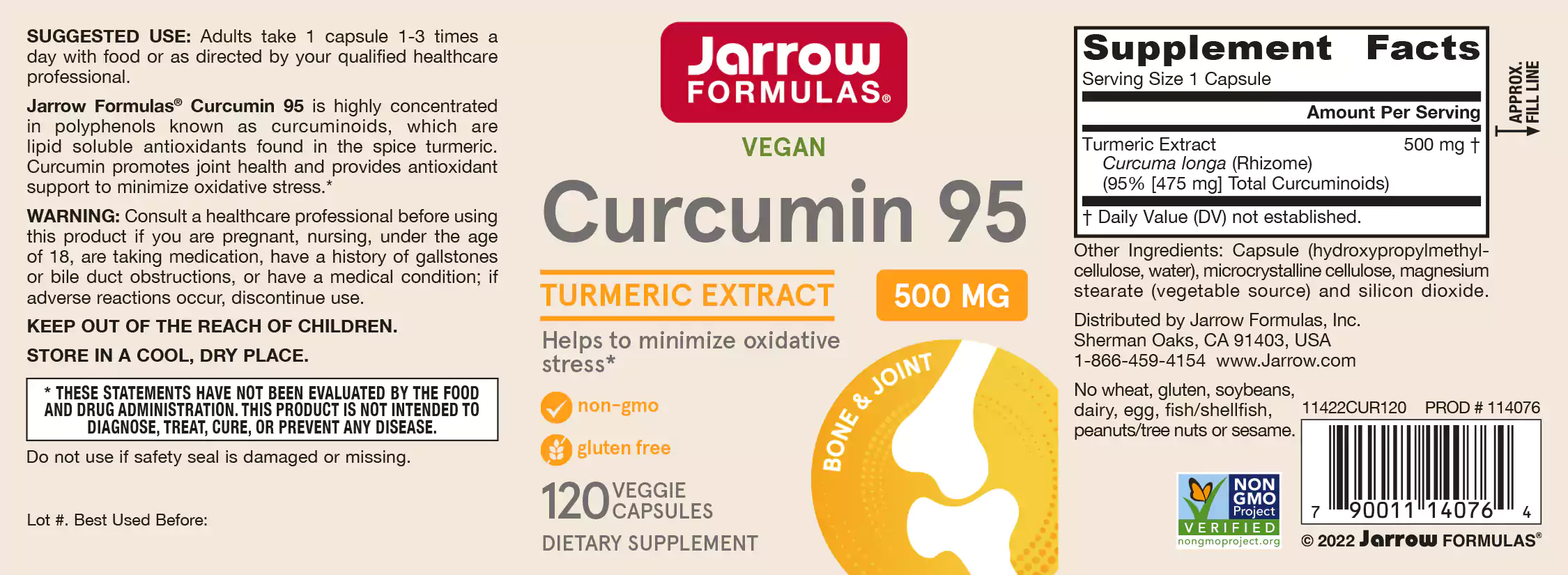Jarrow Formulas Curcumin 95 is een 18:1 concentraat van de antioxidanten zoals gevonden in de kurkuma(koenjit)wortel. Curcumin 95 bevat 95% curcuminoïden (waaronder curcumine, demethoxycurcumine en bisdemethoxycurcumine), welke allen anti-oxidanten zijn. Heel specifiek beschermen curcumine en de derivaten ervan DNA tegen oxidatieve schade door zuurstofradicalen (ROS)