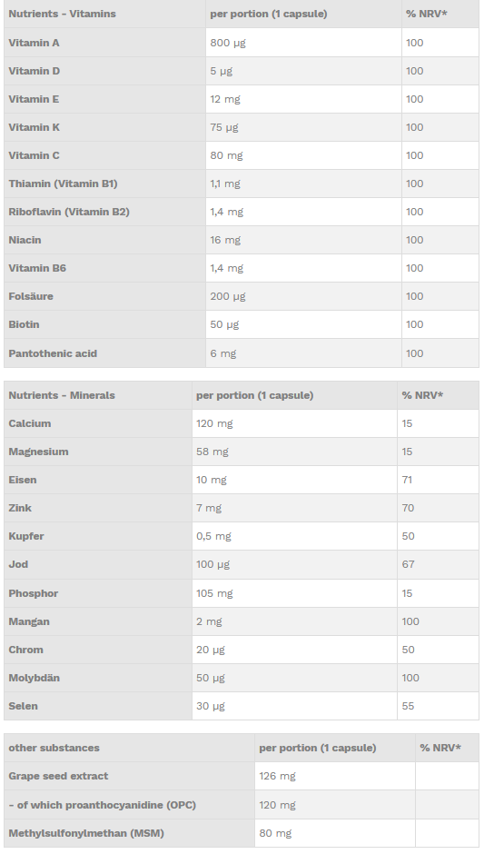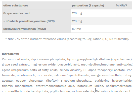 werkzame stoffen (calciumcarbonaat, dikaliumfosfaat, druivepitextract, magnesiumoxide, L-ascorbinezuur, methylsulfonylmethaan, DL-alfa-tocoferylacetaat, ijzerfumaraat, nicotinamide, zinkoxide, calcium-D-pantothenaat, mangaan-II-sulfaat, retinylacetaat, kopergluconaat, riboflavine-5'-natriumfosfaat, pyridoxinehydrochloride, thiaminemononitraat, pteroylmonoglutaminezuur, kaliumjodide, natriummolybdaat, chroom-III-chloridehexahydraat, fylloquinon, natriumseleniet, D-biotine, cholecalciferol), antiklontermiddel (magnesiumzouten van vetzuren, silicumdioxide), v-capsule (hydroxypropylmethylcellulose)