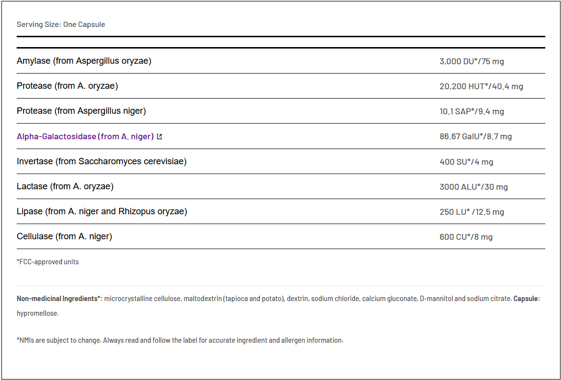 - helpt bij het verteren van eiwitten, vetten, vezels, zetmeel, peulvruchten en lactose