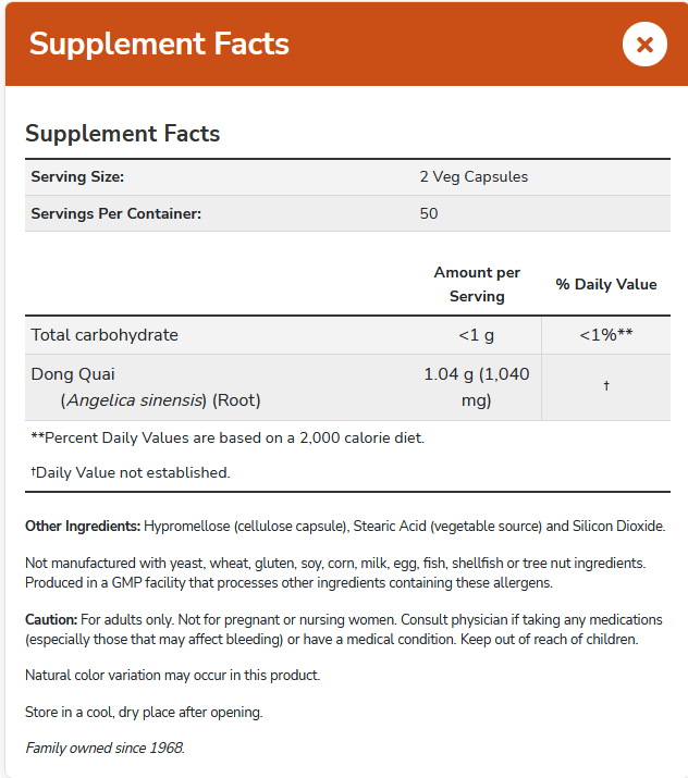 Dong quai (Angelica sinensis) wortel wordt al duizenden jaren bijzonder gewaardeerd door Aziatische kruidengenezers. Dong quai staat algemeen bekend als een versterkende plant voor de vrouwelijke geslachtsorganen.