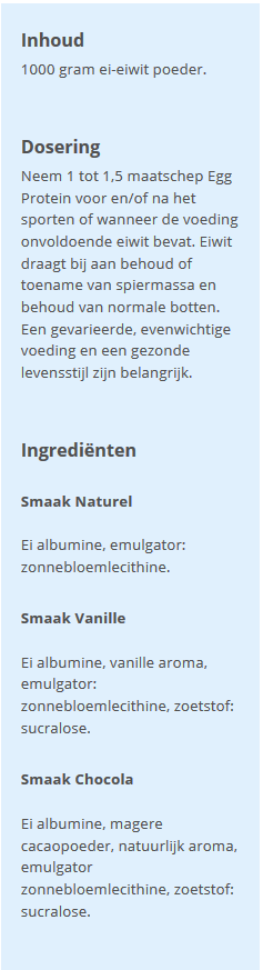 De smaak en textuur van rauwe eieren zijn echter niet aan iedereen besteed. Wie toch op een smakelijke manier wil profiteren van de spierherstellende en spieropbouwende werking van ei-eiwit, kan nu een lekkere eiwitshake maken met Egg Protein.