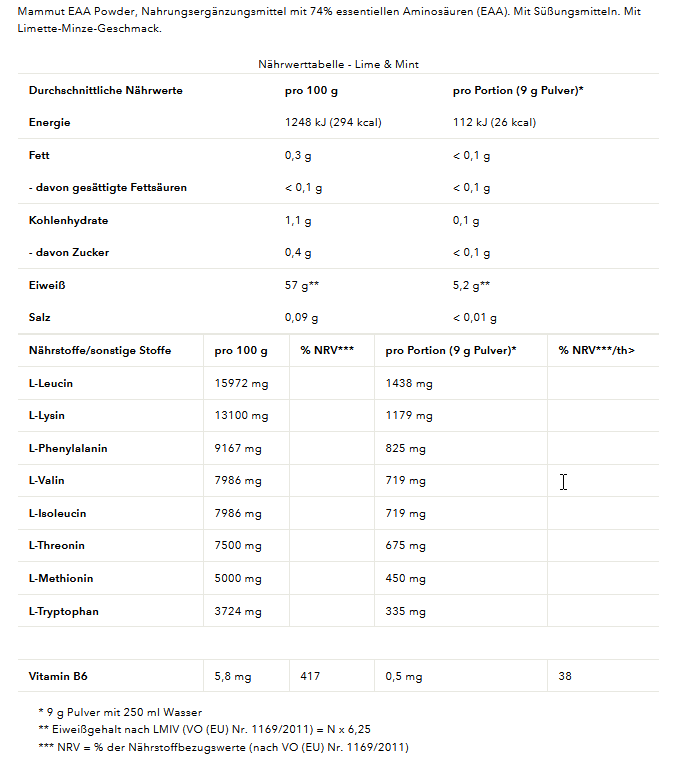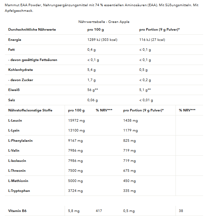 Met de Mammut EAA Powder wordt het lichaam voorzien van alle belangrijke aminozuren. Eén portie levert het lichaam tot 74% hoogwaardige EAA. EAA staat voor essentiële aminozuren, het lichaam kan ze niet zelf aanmaken. Daarom moet ons lichaam ze via voedsel opnemen. Supplementen zijn een goede manier om de lichaamseigen eiwitbalans optimaal te verzorgen. De essentiële aminozuren zijn L-Leucine, L-Isoleucine, L-Valine, L-Lysine, L-Fenylalanine, L-Threonine, L-Methionine en L-Tryptofaan.