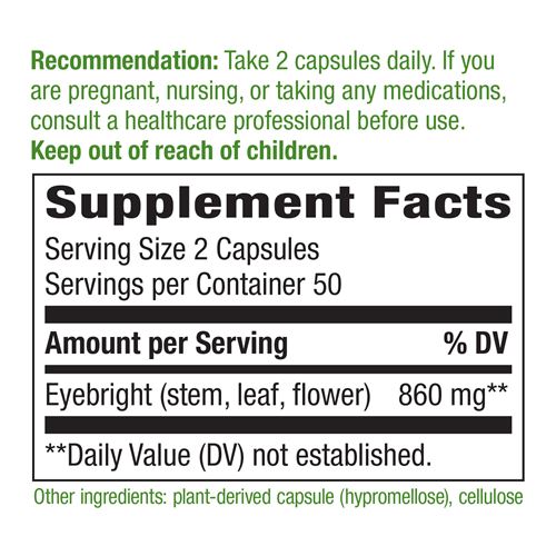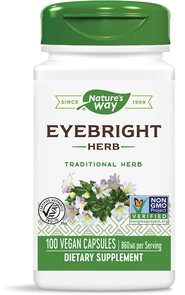 Nature's Way Eyebright (Euphrasia officinalis) is een kleine struik, die van nature in Europa voorkomt. Ogentroost wordt traditioneel gebruikt in een oogbadje of ingenomen om de ogen te ondersteunen.
