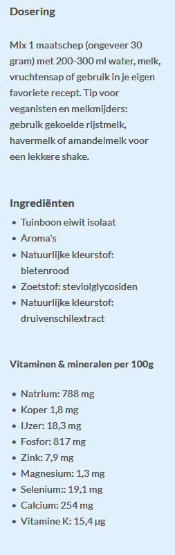 tuinbooneiwitisolaat, natuurlijk bosbessenaroma, natuurlijke kleurstof (bietenrood), zoetstof (steviol glycosides, Stevia), natuurijke kleurstof (druivenschilextract)