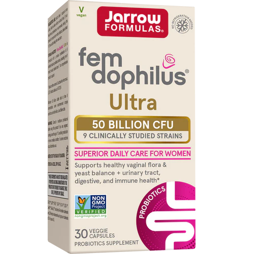 Fem-Dophilus® Ultra 50 miljard 30 capsules biedt 4-in-1 dagelijkse verzorging voor vrouwen. Het bevat 9 van de meest voorkomende vaginale Lactobacillus-soorten waarvan klinisch is aangetoond dat ze effectief zijn om een gezonde vaginale flora te helpen herstellen. Deze Lactobacillus-bacteriën worden gecombineerd met soorten die zich richten op algemene spijsverteringsklachten om zo 4-in-1 voordelen te bieden. Fem Dophilus Ultra ondersteunt de gezondheid van de vagina, urinewegen, spijsvertering en het immuunsysteem in slechts één vegetarische capsule per dag.