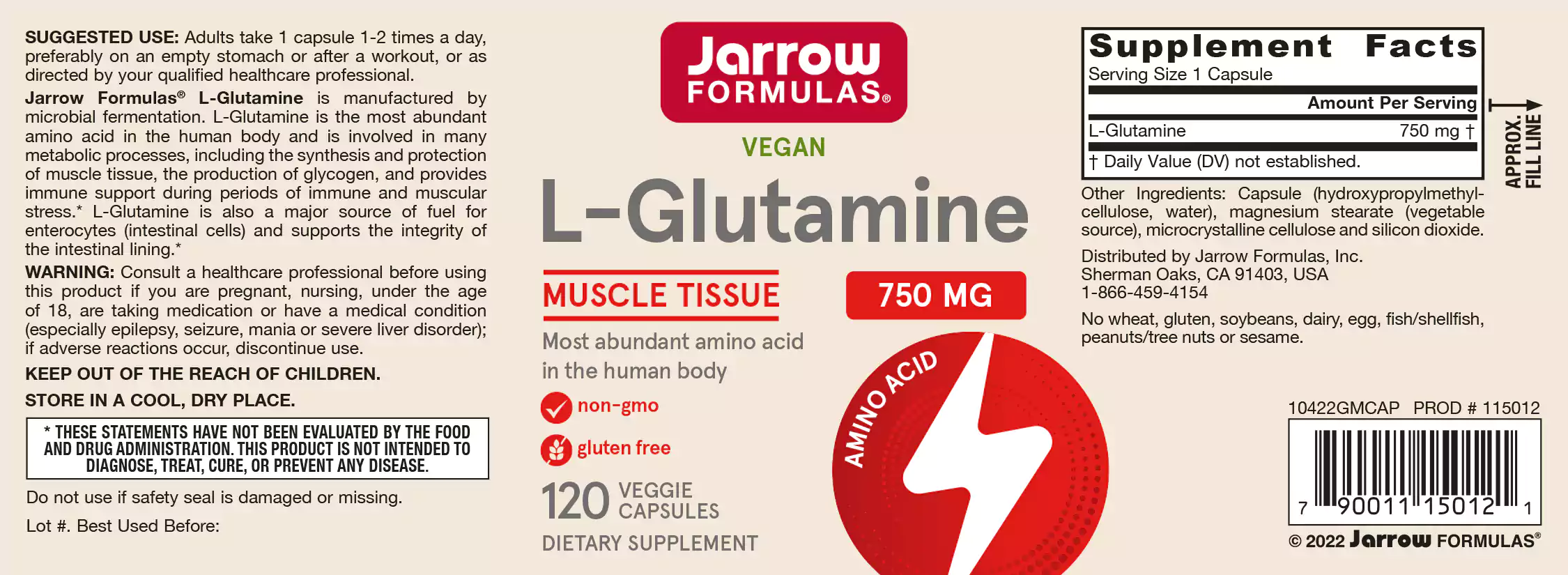 Jarrow Formulas L-Glutamine bevat glutamine, wat zorgt voor een goede darmfunctie. Glutamine helpt de darmen de weerstand te verhogen. Glutamine wordt gebruikt door het lichaam om de voorraden glutamine in de spiercellen aan te vullen. Bij onvrijwillig gewichtsverlies, dunne ontlasting, flinke brandwonden of zware lichamelijke stress ontstaat een tekort aan glutamine dat nodig is om om te kunnen gaan met die stress.