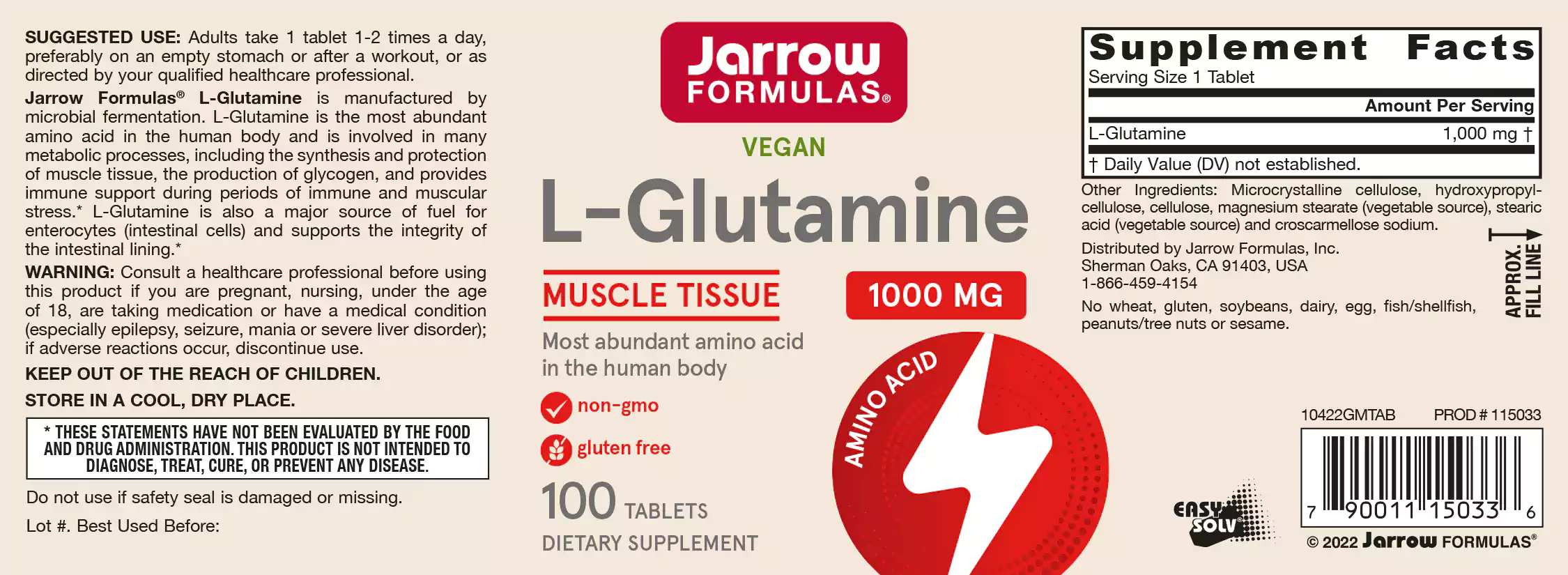 Jarrow Formulas L-Glutamine bevat glutamine, wat zorgt voor een goede darmfunctie. Glutamine helpt de darmen de weerstand te verhogen. Glutamine wordt gebruikt door het lichaam om de voorraden glutamine in de spiercellen aan te vullen. Bij onvrijwillig gewichtsverlies, dunne ontlasting, flinke brandwonden of zware lichamelijke stress ontstaat een tekort aan glutamine dat nodig is om om te kunnen gaan met die stress.
