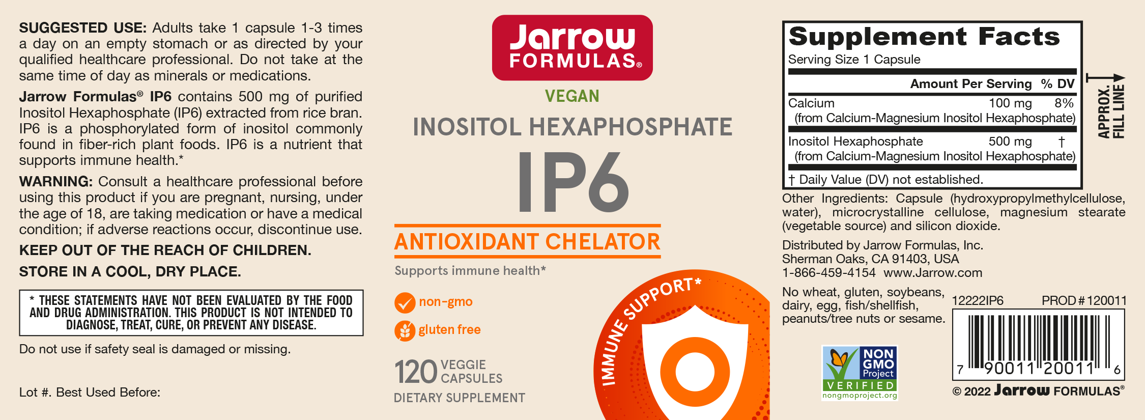 Jarrow Formulas IP6 bevat 500mg gezuiverde inositol hexafosfaat (IP6), dat in Japan geïsoleerd wordt uit rijstvezels. IP6 is een gefosforyleerde vorm van inositol, die veelal aanwezig is in vezelrijke voeding.