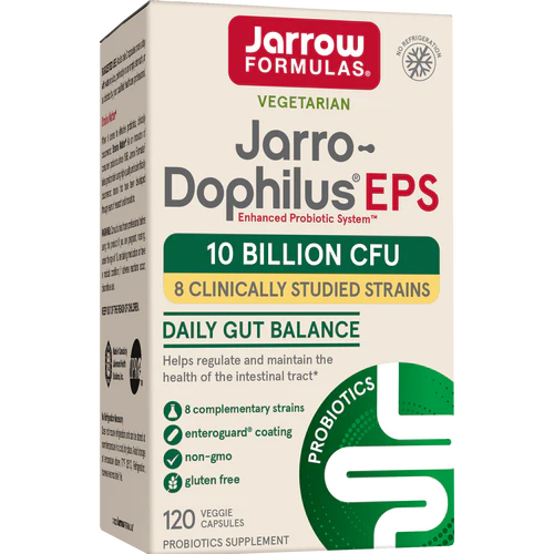 Jarro-Dophilus EPS 10 miljard 120 capsules is Amerika's best verkochte temperatuur-stabiele probioticum met 10 miljard levende bacteriën in elke capsule.