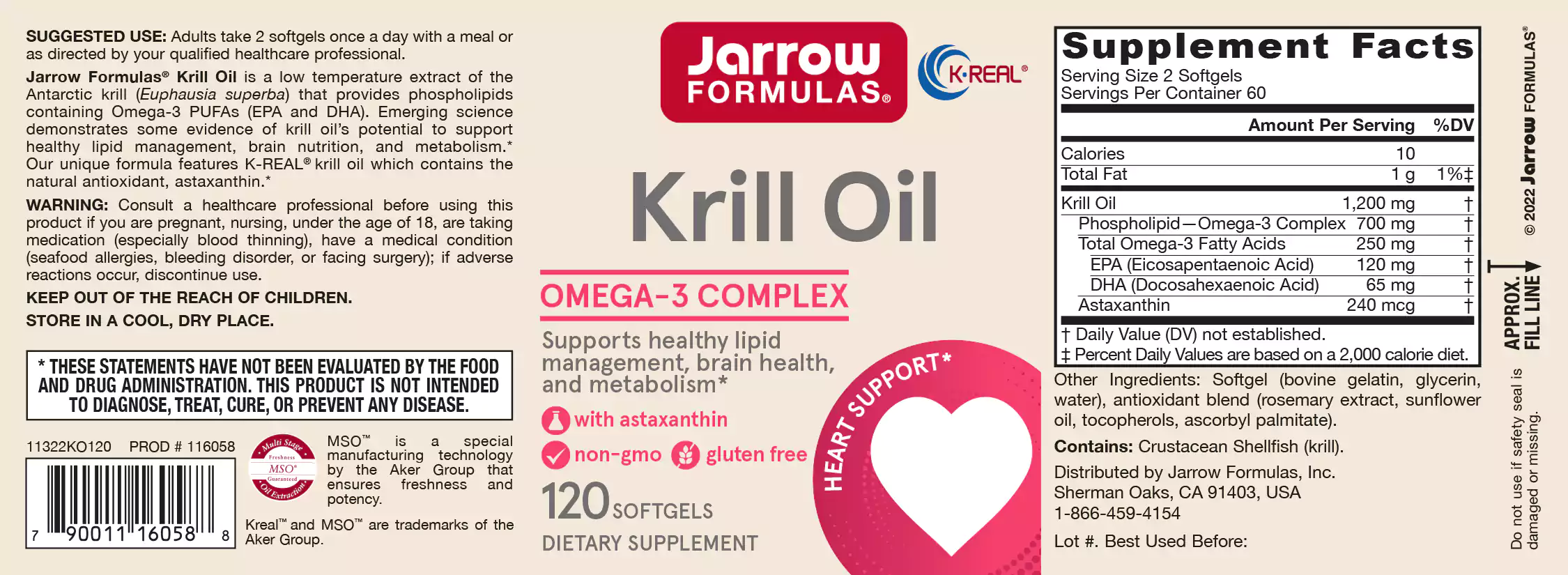 Jarrow Formulas Krill Oil is een traceerbaar, duurzaam en milieuvriendelijk extract van de overvloedige Antarctische krill (Euphausia superba) op lage temperatuur. Het bevat unieke fosfolipiden die rijk zijn aan Omega-3 PUFA's (EPA en DHA) en andere antioxidanten, waaronder astaxanthine. Krillolie is klinisch gevalideerd om het lipidenbeheer, de voeding van de hersenen en het lever- en glucosemetabolisme te verbeteren.