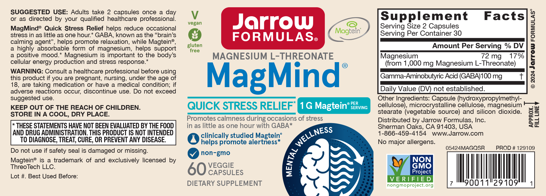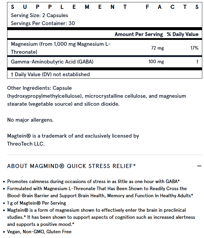 Jarrow Formulas MagMind Stress Resistance+rhodiola+theanine met magnesiumthreonaat of Magtein is de enige vorm van magnesium die vrij gemakkelijk door de bloed-hersenbarrière heen kan komen en mede daardoor een aantoonbaar gunstige invloed heeft op het leervermogen, geheugen en hersengezondheid.