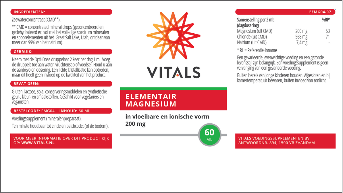 Vitals Elementair Magnesium heeft een positieve invloed op de werking van het zenuwstelsel en draagt bij aan de energiestofwisseling. Magnesium draagt bij aan de vermindering van vermoeidheid. Daarnaast draagt het bij aan hersen- en zenuwfuncties betrokken bij concentratie, leervermogen, het geheugen en het beredeneervermogen. Magnesium is gunstig voor een goede geestelijke balans. Ook draagt magnesium bij aan een goede elektrolytenbalans. Chloride ten slotte draagt bij tot de normale werking van de spijsvertering in de maag.