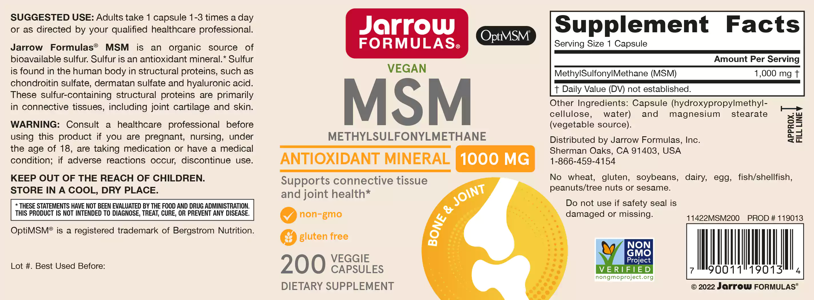 Jarrow Formulas OptiMSM 200 capsules bestaat uit een organische bron van zwavel, een mineraal met bijzondere kwaliteiten als antioxidant. MSM sterkt de huid, bindweefsel in de gewrichten en de opbouw van haarvezels.