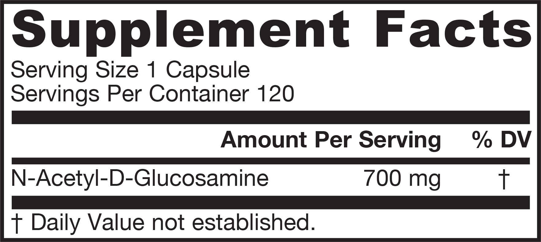 werkzame stof (n-acetyl-glucosamine), v-capsule (hydroxypropylmethylcellulose, water), vulstof (microkristallijne cellulose, plantaardig magnesiumstearaat), siliciumdioxide (antiklontermiddel)