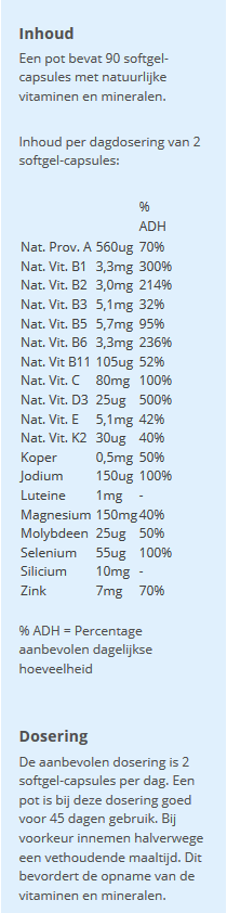 Natural Multi bevat per dagdosering 3.36 mg beta-caroteen. Voor de gemiddelde mens geldt dat het lichaam hieruit 560 microgram vitamine A vormt. Dit komt overeen met 70% van de aanbevolen dagelijkse hoeveelheid van vitamine A.