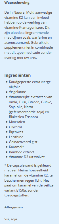De natuurlijke vitamine K2 in Natural Multi is afkomstig van gefermenteerde sojabonen (‘Natto’). Deze vitamine K2 is van het subtype MK-7.