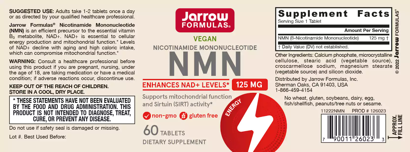 Jarrow Formulas NMN Nicotinamide Mononucleotide bevat NAD+, een efficiënte metaboliet van de essentiële vitamine B3 , wat een essentiële vitamine is voor een goede werking van mitochondriën, waardoor de cel in staat is om zowel glucose als vetzuren om te zetten in energie.