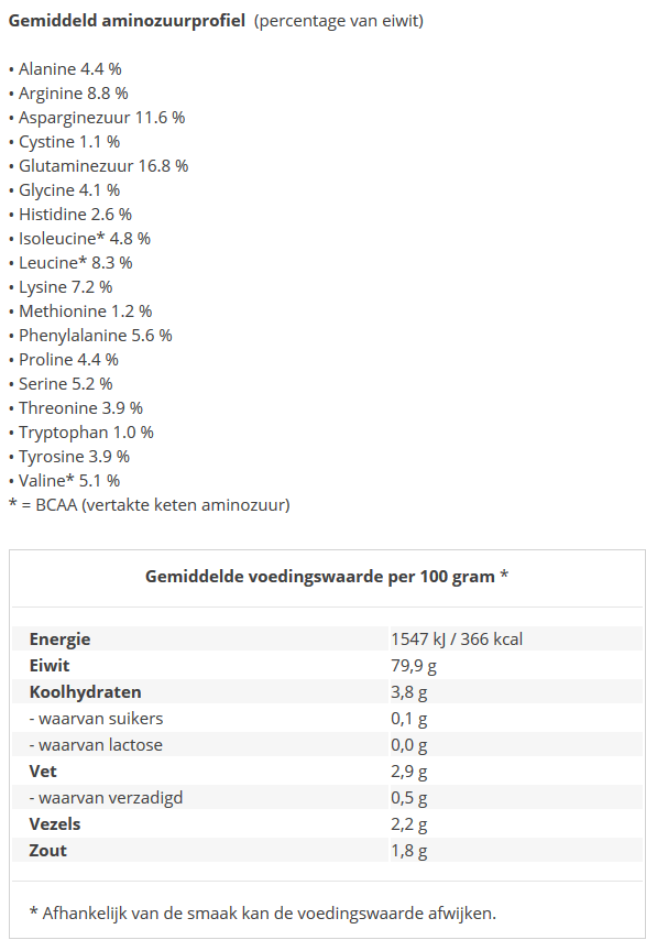 Erwteneiwit isolaat is een plantaardig eiwit met een hoog gehalte aan essentiële aminozuren. Met name de essentiële ‘vertakte keten aminozuren’ (BCAA’s) zijn met ruim 20% heel goed vertegenwoordigd. Het hoge gehalte essentiële aminozuren en BCAA’s maakt erwteneiwit geschikt voor sporters en mensen op een eiwitdieet.