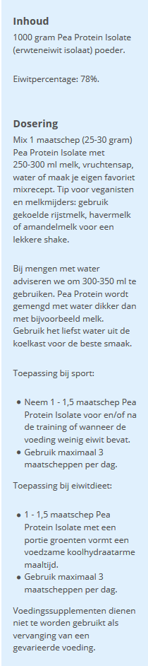 sport: neem 1 - 1,5 maatschep Pea Protein Isolate voor en/of na de training of wanneer de voeding weinig eiwit bevat. Gebruik maximaal 3 maatscheppen per dag.