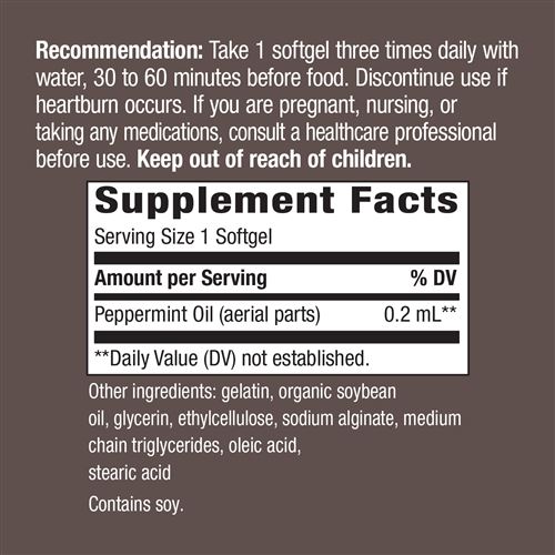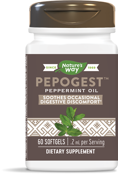 Nature's Way Pepogest Peppermint Oil is goed voor de ingewanden. De essentiële olie in pepermuntbladeren kalmeert een opstandige maag en darmen, zoals dit veroorzaakt kan worden door nervositeit, een te calorierijke maaltijd en/of veranderingen in het dieet.