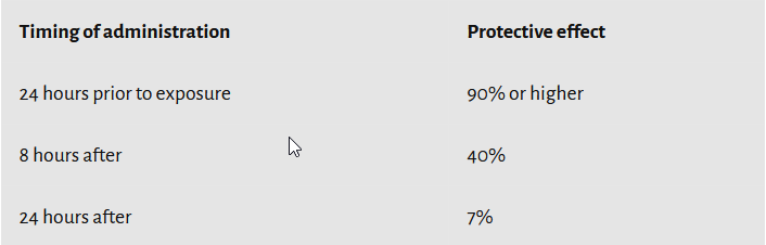 De radioactieve jodiumblokkerende dosis KI moet aanwezig zijn vóór blootstelling aan radioactief jodium (I-131). Maar de dosis mag niet meer dan 24 uur vóór de blootstelling worden ingenomen, anders wordt de doeltreffendheid ervan verminderd.