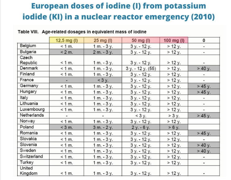 Sommige Europese landen hadden volwassenen ouder dan 40 vrijgesteld van KI-dosering "in geval van contra-indicaties zoals jodiumallergie, verstoring van de schildklierfunctie of thyreoïditis"