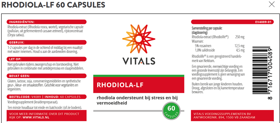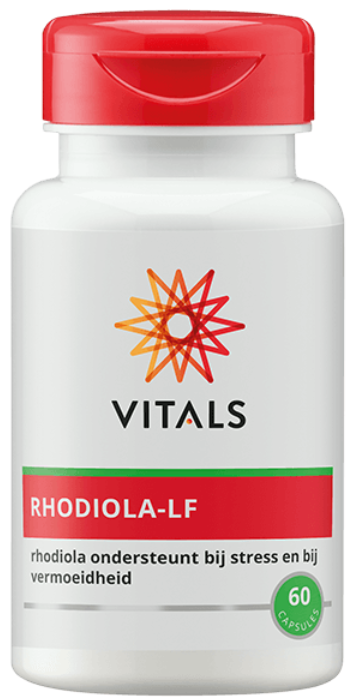 Het plantengeslacht rhodiola bestaat uit meer dan 130 soorten. De bekendste en meest onderzochte soort is Rhodiola rosea of rozewortel, die onder andere groeit in het koude Siberië. Rhodiola wordt al meer dan 2000 jaar gebruikt als kruidenpreparaat. Rhodiola heeft een werking als adaptogeen. Dit wil zeggen dat rhodiola kan helpen om de veerkracht te behouden in stresssituaties. Tevens kan het ondersteuning bieden bij vermoeidheid. Het hoogwaardige extract Rhodiolife® in Rhodiola-LF van Vitals bevat maar liefst 5% rosavinen en 1,8% salidroside, de belangrijkste werkzame stoffen in rhodiola.