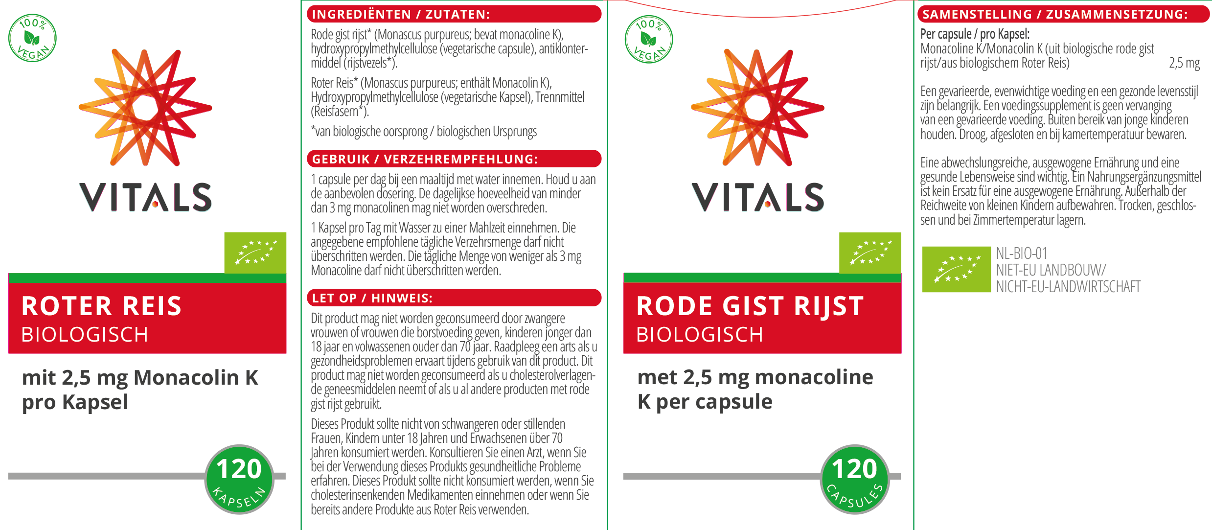 Jarenlang heeft Vitals naar volle tevredenheid van een groot aantal trouwe gebruikers het product Rode Gist Rijst Biologisch in het assortiment gehad. Dit product bevatte 10 mg monacoline K per capsule waardoor volstaan kon worden met één capsule per dag. Recent is er nieuwe Europese wetgeving van kracht geworden waardoor het gehalte monacoline K in rode gist rijst-producten voortaan gebonden is aan een wettelijk maximum van minder dan 3 mg monacoline K per dagdosering. Het vervangende product Rode Gist Rijst Biologisch bevat 2,5 mg monacoline K per dagdosering en voldoet daarmee ruimschoots aan deze nieuwe wetgeving. Op het etiket staat de volgende wettelijk verplichte tekst: ‘Houd u aan de aanbevolen dosering. De dagelijkse hoeveelheid van minder dan 3 mg monacolinen mag niet worden overschreden.’