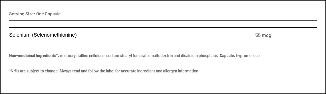 werkzame stof (selenomethionine), vulstof (microkristallijne cellulose, natriumstearylfumaraat, maltodextrine en dicalciumfosfaat), capsule (hypromellose)