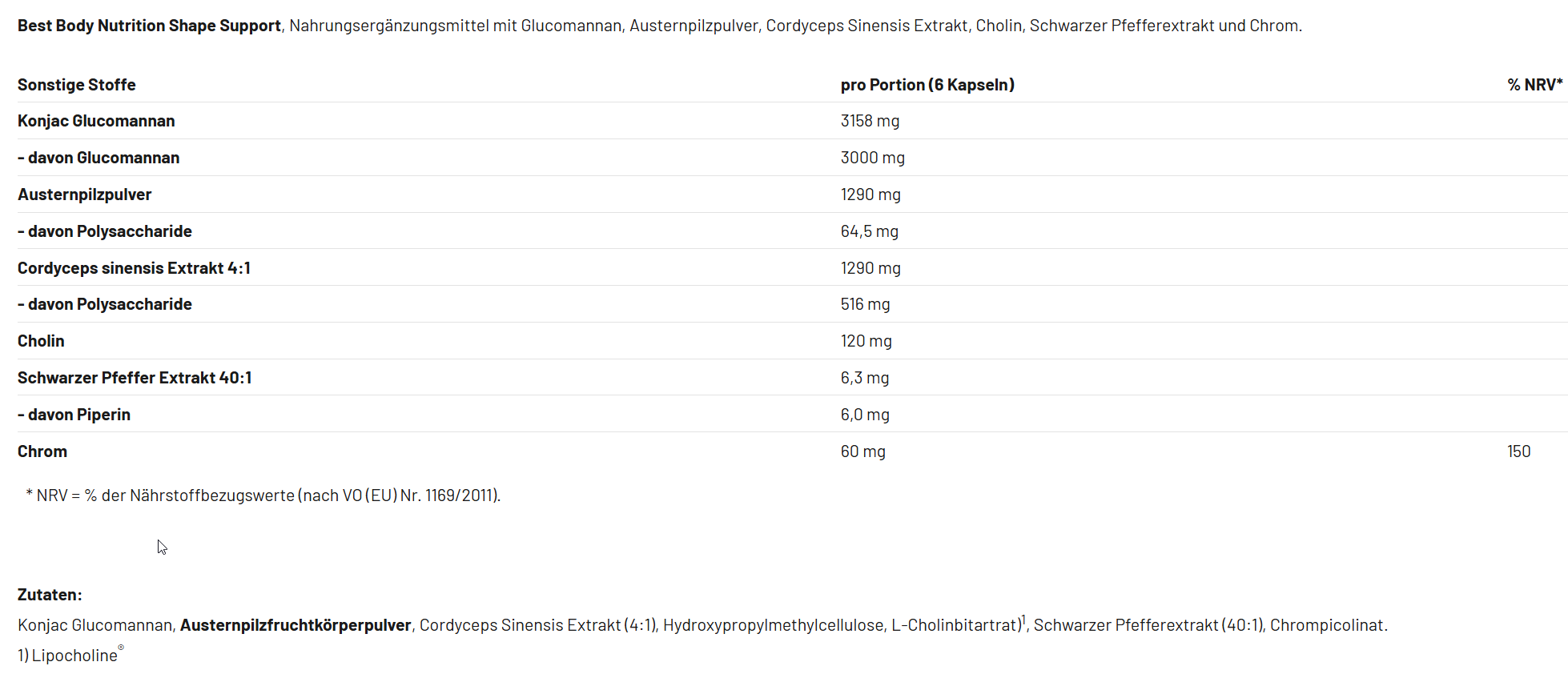 Best Body Nutrition Shape Support, een voedingssupplement met glucomannan, oesterzwampoeder, Cordyceps sinensis-extract, choline, zwarte peperextract en chroom