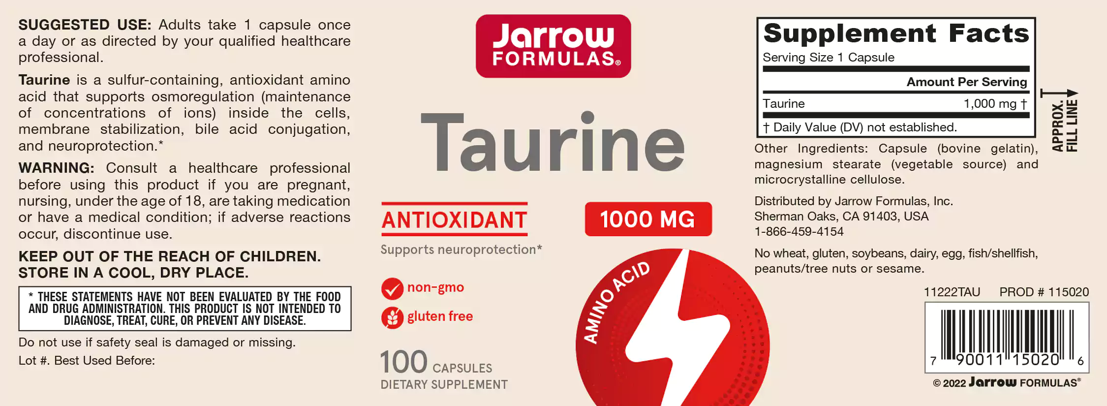 Jarrow Formulas Taurine is een zwavelbevattend anti-oxidant en aminozuur, die de cel beschermt tegen schade van vrije radicalen en helpt bij de osmoregulatie (het in stand houden van de juiste concentratie van ionen) binnen de cel, de celwand stabieler maakt en sperma beweeglijker en eveneens van belang is bij de vorming van galzuren, zenuwoverdacht en het prestatievermogen van een sporter beinvloedt (het heeft een op insuline gelijkende werking voor betere toevoer van glucose naar de spieren).