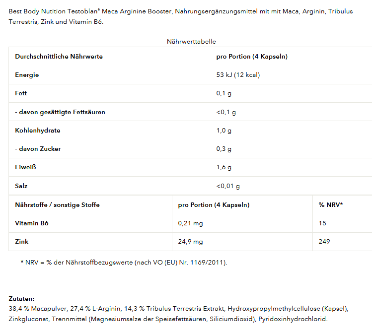 * Vitamine B6 draagt bij aan de vermindering van vermoeidheid en moeheid en aan een normaal energieleverend metabolisme. Zink draagt bij tot de instandhouding van normale testosteronniveaus in het bloed.Best Body Nutrition Testobolan® Maca Arginine Booster, voedingssupplement met maca, arginine, tribulus terrestris, zink en vitamine B6.