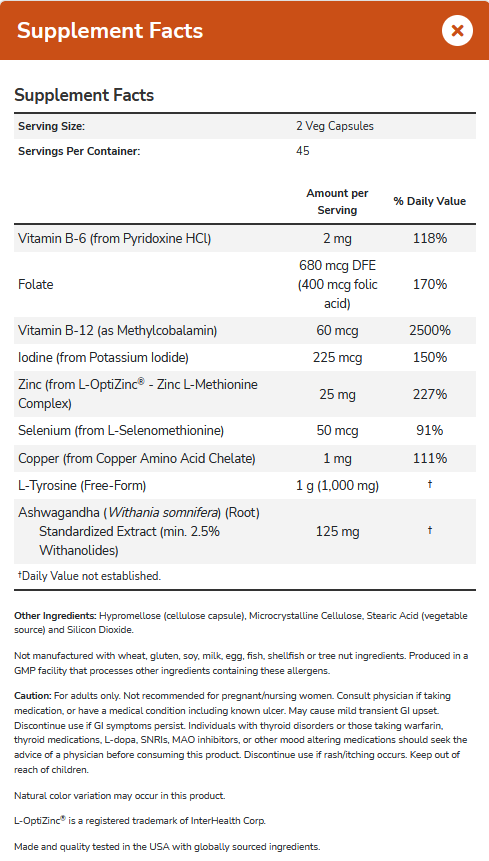 werkzame stoffen (L-tyrosine, ashwagandha, zinkmethionine, koper-aminozuurchelaat, folaat, kaliumjodide, methylcobalamine, selenomethionine), v-capsule (hypromellose), vulstof (microkristalijne cellulose, plantaardig stearinezuur, siliciumdioxide)