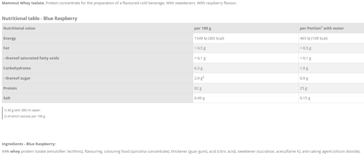 Mammut adviseert om 1 portie van 30 g (twee afgestreken schepjes) Whey Isolaat te mengen in 300 ml water en licht gekoeld te genieten voor of na intensieve trainingen. Whey Isolaat is verkrijgbaar in twee fruitige smaken.
