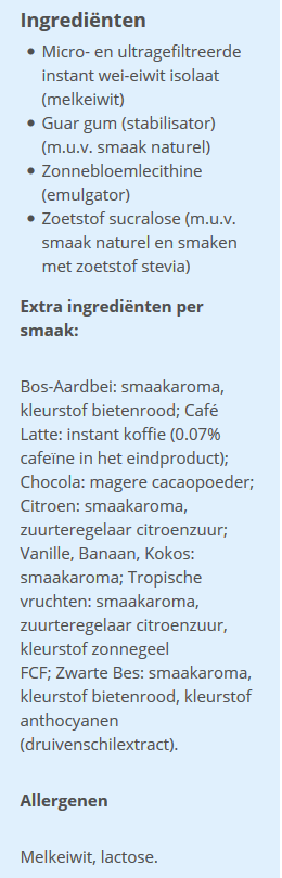 smaak: micro- en ultragefiltreerd instant wei-eiwitisolaat (melk), stabilisator (guar gum), emulgator (soja-lecithine), zoetstof (sucralose of stevia), smaakstof (natuurlijk aroma)