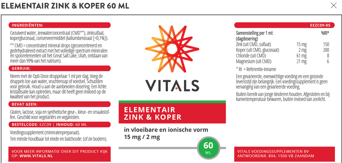 Zink en koper zijn antagonisten. Een hoge inname van zink (50 mg of meer per dag) gedurende langere tijd (langer dan een maand) kan leiden tot een lage koperstatus. In dit product zijn zink en koper gecombineerd aanwezig.