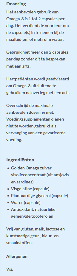 active ingredients (Golden Omega pure fish oil concentrate from anchovies and sardines, natural mixed tocopherols), softgel capsule (fish gelatin, vegetable glycerol, water)