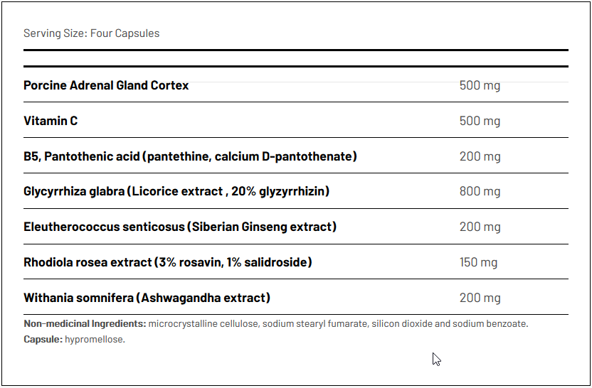 active ingredients (licorice root extract, porcine adrenal gland, vitamin C,  vitamin B5, Siberian ginseng, ashwagandha and rhodiola extract), filler (microcrystalline cellulose, sodium stearyl fumarate, sodium benzoate), anticoagulant (silicon dioxide), capsule (hypromellose)