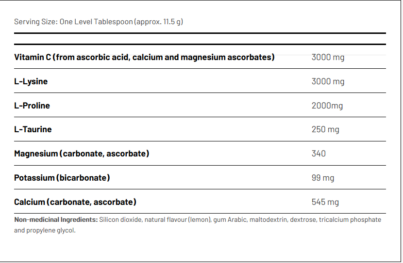 active ingredients (vitamin C, lysine, proline, taurine, magnesium carbonate, magnesium ascorbate, potassium bicarbonate, calcium carbonate and calcium ascorbate), anticoagulant (silicon dioxide), natural lemon flavour, Arabic gum, maltodextrin, detrose, tricalcium phospate