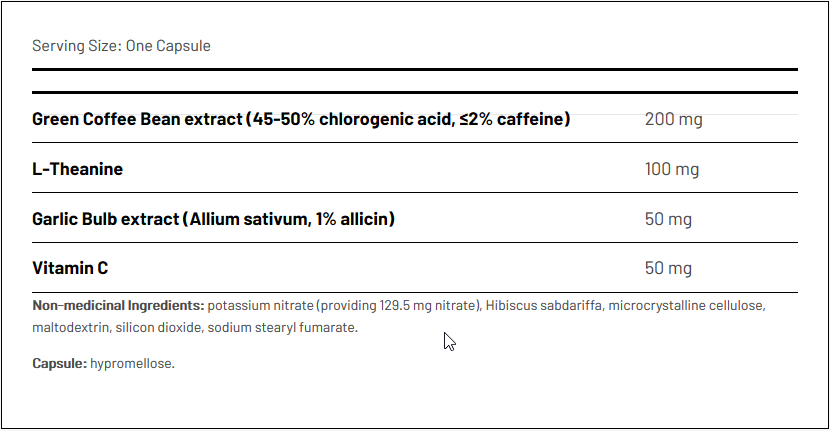 active ingredients (green coffee bean extract, potassium nitrate, theanine, garlic extract, vitamin C, hibiscus), filler (microcrystalline cellulose, maltodextrin), anticoagulant (silicon dioxide), filler (sodium stearyl fumarate), capsule (hypromellose)